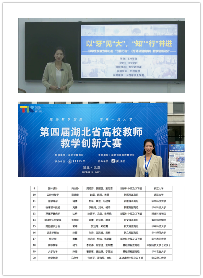 (通讯员 :沈昕) 4月20日—21日,湖北省第四届高校教师教学创新大赛在华中农业大学举行。ok138cn太阳集团沈昕团队代表学校参与省赛角逐,并最终凭借《牙体牙髓病学》课程荣获湖北省新医科中级及以下组特等奖,晋级国赛,学校荣获优秀组织奖,这是我校在教师教学创新大赛中的历史性突破。