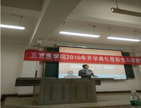 (通讯员:叶支源、雷婷)9月12日上午8:30,五官医学院于教3-301举行了2016年新生开学典礼。出席本次活动的领导老师有五官医学院党总支书记范杉、 副书记佘同辉、副院长操盛春、口腔医学专业主任陈黄琴、眼视光专业主任张晓斌 、综合办主任胡勇、教学办主任黎慧珍、学工办主任程鹏,辅导员涂芳、雷婷,以及2016级新生班主任。此次活动由佘书记主持。