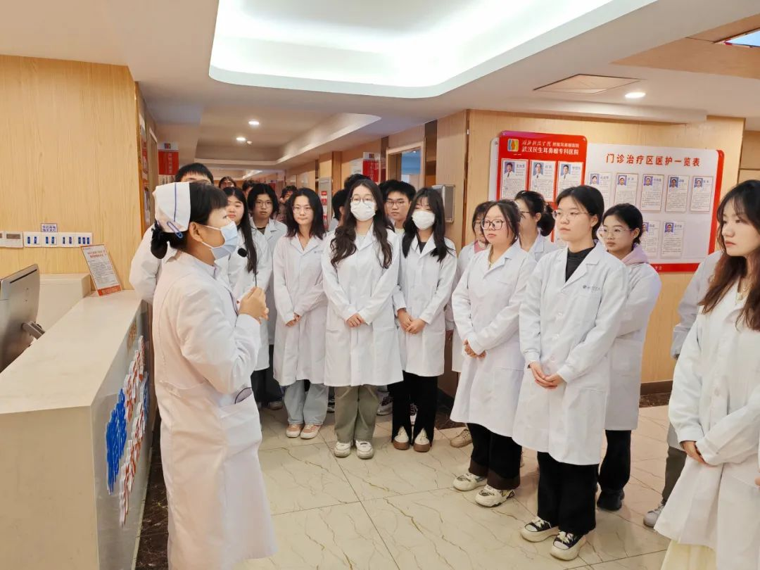 同学们在武汉民生耳鼻喉专科医院的各区域负责人带领下来到院内综合门诊、电子鼻咽喉镜室、内窥镜检查室、耳科治疗室、电测听室、住院病区、睡眠检测室、治疗区等院内各区进行参观,让大家全面了解医院的工作环境和医疗服务流程。