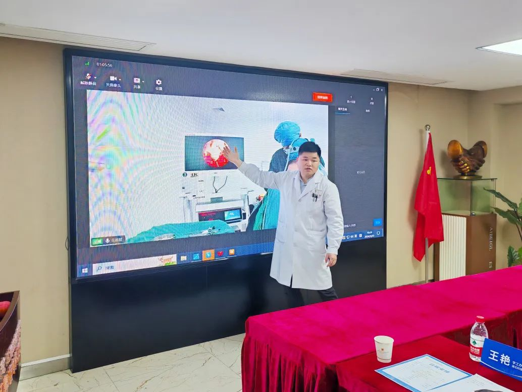 在会议室里的同学们通过转播画面清晰地看到了手术的全过程,在医院住院总医师崔传杰的细致讲解下,将理论知识对照实际操作,直观感受现代医学技术的魅力。