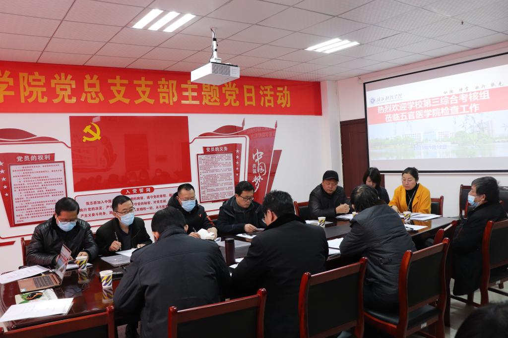 本网讯(通讯员:黄红)1月12日上午,党委常委、副校长、第三综合考核组组长钟儒刚带队到五官医学院进行2020年度综合考核工作,第三综合考核组成员、五官医学院党政领导班子成员、全体教职工参加了考核工作汇报会。汇报会由发展规划处处长彭少华主持。