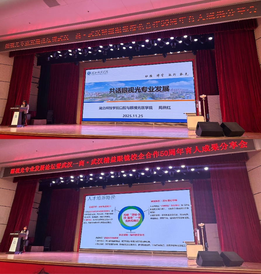 2025年11月24日,“眸光五十载,匠心谱华章——眼视光专业发展论坛暨武汉一商·武汉精益眼镜校企合作50周年育人成果分享会”在武汉市第一商业学校隆重举行。我院周燕红院长作为高校专家代表受邀出席。