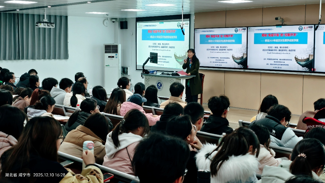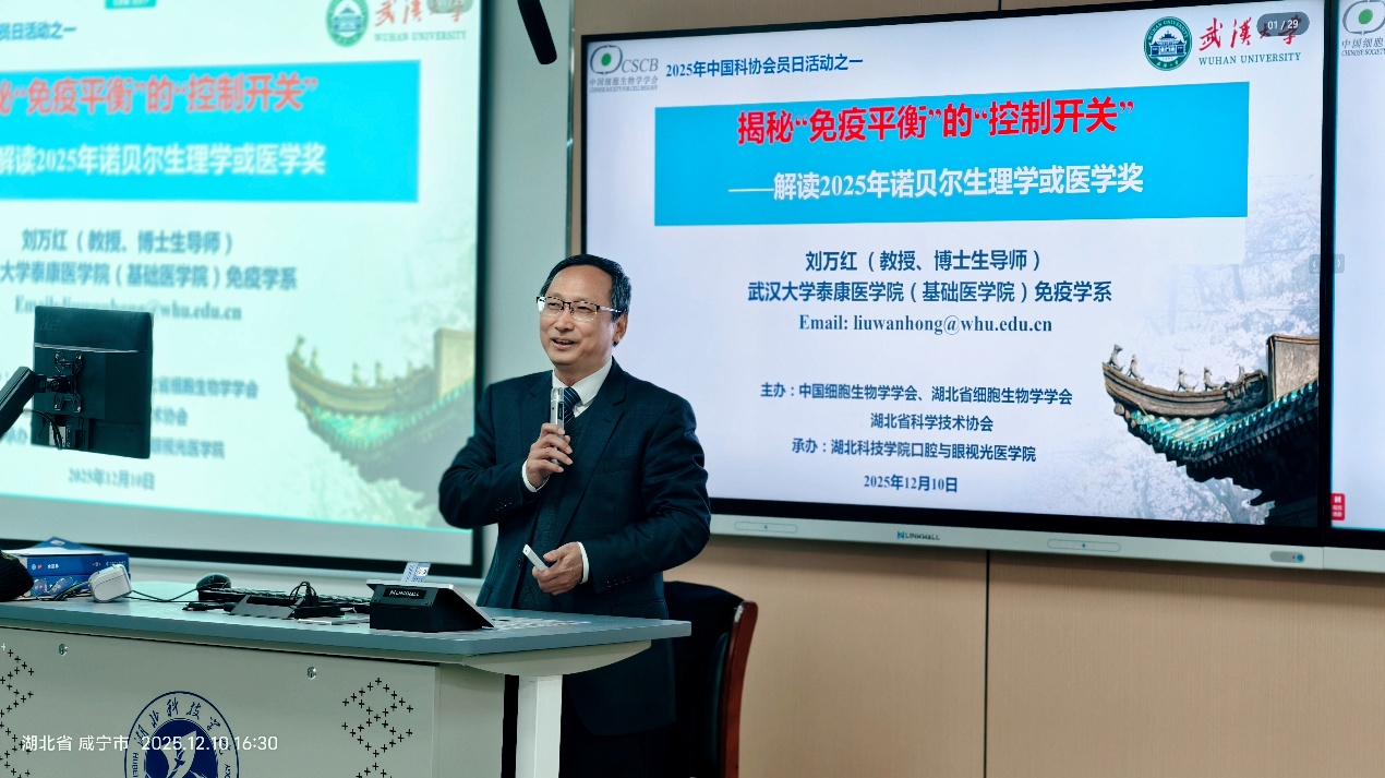 2025年12月10日下午,由中国细胞生物学学会指导,湖北省细胞生物学学会与OK138太阳集团ok138cn太阳集团联合举办的“揭秘‘免疫平衡’的‘控制开关’——2025年诺贝尔生理学或医学奖解读”科普讲座在我校成功举行。武汉大学泰康医学院(基础医学院)免疫学系刘万红教授担任主讲,湖北省细胞生物学会副理事长李文化教授代表学会出席活动,ok138cn太阳集团院长周燕红教授主持讲座。